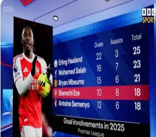 2025年英超参与进球排名: 哈兰德——25 萨拉赫——23 姆伯莫——21 埃泽——18 塞梅尼奥——18 消息来源:BBC 3 - 阿森纳对上切尔西 英超第12轮比赛,切尔西客场2-0击败伯恩利。 据Squawka统计,切尔西英超客场3连胜并且未失球,2021年11月之后首次。