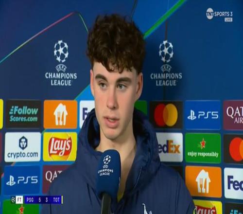 | 热刺在欧冠客场3-5不敌巴黎圣日耳曼。赛后,热刺中场阿奇-格雷接受了TNT体育的采访。