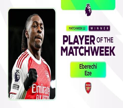 | 官方消息,阿森纳中场埃泽当选英超联赛第12轮最佳球员。