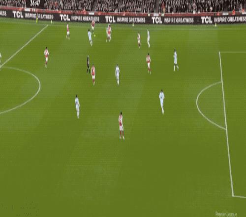 第37分钟,阿森纳前场抢断,梅里诺起到轴心作用,赖斯的传中正好越过两名后卫,马杜埃凯的射门被后卫挡出底线。