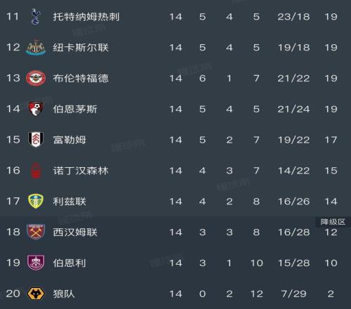 英超积分榜,曼联11被逼平,与利物浦同分,西汉姆联陷入降级区
