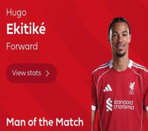 | 英超第15轮,利物浦客场3-3战平利兹联,此役上演梅开二度的埃基蒂克当选全场最佳球员。