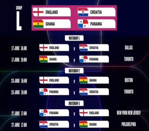 第一轮: 6月18日06:00 英格兰vs克罗地亚 比赛地点:达拉斯 6月18日08:00 加纳vs巴拿马 比赛地点:多伦多 第二轮: 6月24日05:00 英格兰vs加纳 比赛地点:波士顿 6月24日08:00 巴拿马vs克罗地亚 比赛地点:多伦多 第三轮: 6月28日06:00 巴拿马vs英格兰 比赛地点:纽约新泽西 6月28日06:00 克罗地亚vs加纳 比赛地点:费城 【上咪咕独家看英超】 |