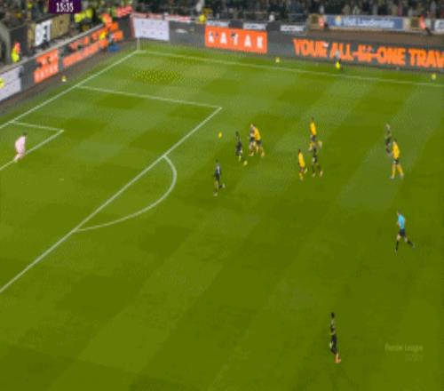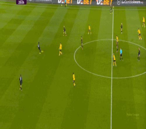 所以,当狼队在进攻端能够有所盼头,加上主场作战,也需要尝试向前的压力下,曼联确实不会缺少空间,于是在第25分钟,曼联在前场完成抢断,库尼亚和布鲁诺的配合没有踩到点儿上,但还是打出了进球: