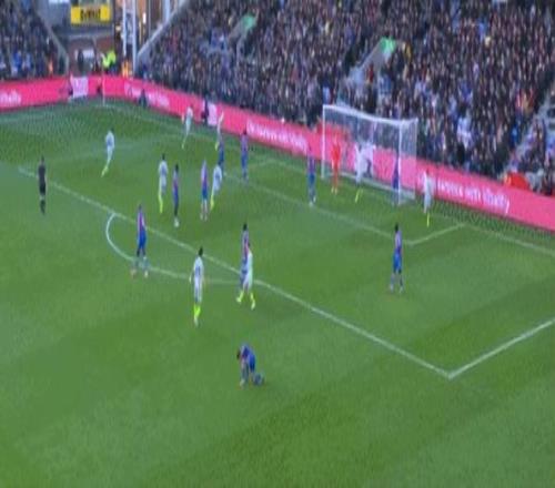 周旋了40分钟,水晶宫防守出现了问题。也许是上半时就要结束,也许是体力下滑了,这个时间主队在布置防御时漏洞很多,可不像是开赛时那么紧密、反击那么迅速了。