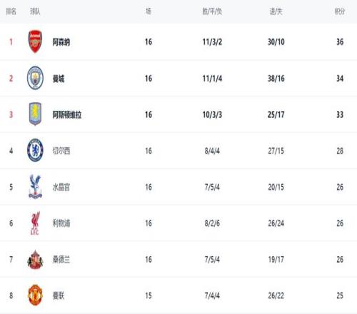 在积分榜上,阿森纳依然占据榜首位置,拿到了36分。曼城步步紧逼,排名第2,拿到34分。前2的差距只有2分。接下来阿森纳一旦丢分,很可能就会被挤下榜首位置。阿斯顿维拉33分排名第3,比阿森纳也就少了3分。切尔西28分排名第4。水晶宫、利物浦和桑德兰都是26分。曼联以25分排名第8。至于热刺,战绩糟糕,排名第11。
