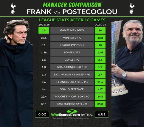 | 客场0-3不敌诺丁汉森林后,托马斯-弗兰克在北伦敦所承受的压力进一步加大,这赛季球队的比赛风格以及糟糕的主场战绩已经让球迷的不满情绪不断升温,Whoscored也对比了弗兰克本赛季前16轮和上赛季澳波前16轮的数据。