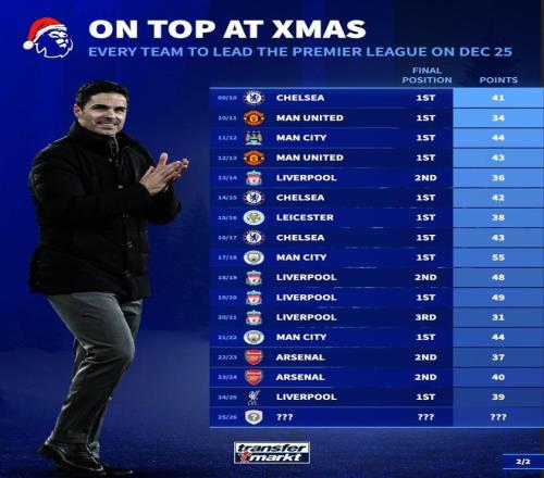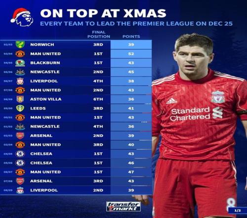 | 德国转会市场列出了近年圣诞期间英超榜首球队的最终排名,33支圣诞节登顶的球队,只有17支夺冠,近7年仅3队最终夺冠。