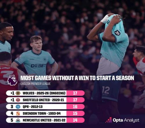 | 英超第17轮,狼队主场0-2不敌布伦特福德,至此,狼队本赛季前17轮比赛未尝一胜,追平英超历史开局最长不胜纪录。