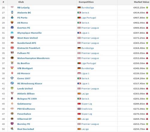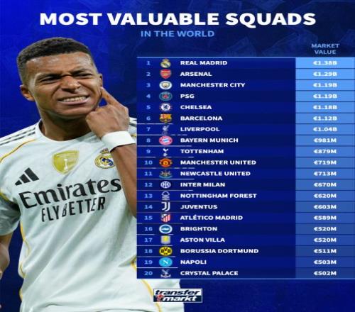 世界身价百强球队!皇马居首,英超6队跻身前10,亚洲4队在列