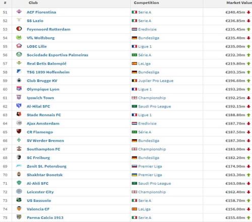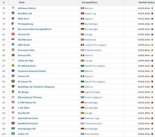 在亚洲球队里,利雅得新月排名最高,以1.92亿排名第62位,其次是吉达国民(第71位,1.63亿)、吉达联合(第87位、1.40亿)以及利雅得胜利(第90位、1.39亿)。 |