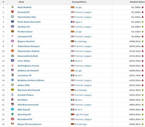 | 周三,《转会市场》公布2025年全世界身价最高的100支足球球队,皇马以13.8亿欧元排名榜首,阿森纳、曼城分别排名第2、3位。