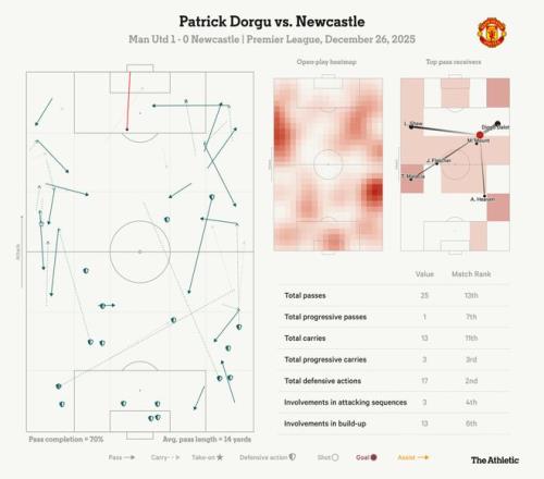 丨多尔古的表现有多出色? 如果你在看前面关于布鲁诺的那段内容时觉得“哇,他们就这样把多尔古的进球一笔带过了”,别担心——这一整段都是他应有的赞美。 这球起于一记达洛抛出的的界外球,皮球直奔小禁区,沃尔特马德先把球头球解围,但球又落到禁区边缘,多尔古在此处用一记精彩的左脚凌空抽射将球送入网内。 加里·内维尔在天空体育的解说里称其为“好一脚劲射”。多尔古在右路的表现像是脱胎换骨。比赛早段他在边路尝试了一些聪明的传跑套路,随后又送出过一记低平传中,舍什科完成了射门但未能命中目标。 第42分钟,他逼得安东尼·戈登把球带出界,帮助曼联赢得界外球。他的防守拼抢换来了老特拉福德观众的掌声,随后还得到了卡塞米罗的的鼓励。 “继续做你正在做的事,”这位传奇后腰的话语给了他信心。到60分钟时,多尔古累计触球达36次,覆盖了大片的场地空间。 曼联去年1月签入的这名21岁球员正以强势姿态结束这一年。曼联对塞门约的兴趣显示阿莫林可能未来想要更具攻击性的边路球员,但多尔古目前的表现足以让他继续出现在主帅的2026年计划中。