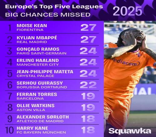 | 北京时间1月1日,知名数据机构Squawka统计出了2025年欧洲五大联赛错失绝佳机会次数最多的10名球员,莫伊塞-基恩和姆巴佩同以27次并列第一,哈兰德24次并列第二,哈里-凯恩上榜。