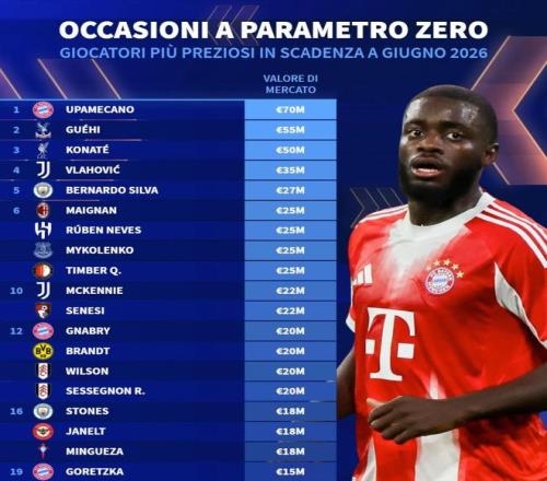 | 北京时间1月3日,德转统计出了现有合同今年6月到期的球员身价榜,拜仁中卫于帕梅卡诺7000万欧元高居第一,水晶宫中卫格伊5500万欧元第二,利物浦中卫科纳特5000万欧元第三。