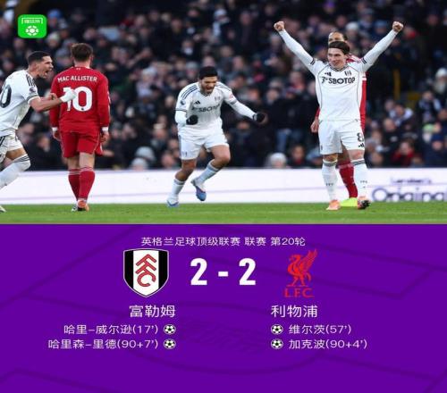 北京时间1月4日,英超联赛第20轮,富勒姆坐镇主场迎战利物浦。上半场,劳尔-希门尼斯助攻,哈里-威尔逊反越位破门先拔头筹;下半场,维尔茨疑似越位位置的进球经VAR认定有效,尾声阶段比赛进入高潮,加克波在禁区内推射破门反超比分,但哈里森-里德世界波破门迅速还以颜色。最终,利物浦客场2-2战平富勒姆。 关键事件 第17分钟,哈里-威尔逊反越位单刀破门,富勒姆1-0利物浦!