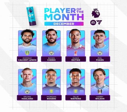 | 官方消息,英超12月最佳球员候选名单公布,哈兰德、埃基蒂克、勒温、福登、摩根-罗杰斯、沃特金斯、谢尔基、哈里-威尔逊在列。