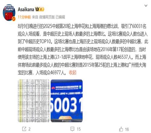 德转朱艺:昨日60031人观战申花12海港,创上海德比之最