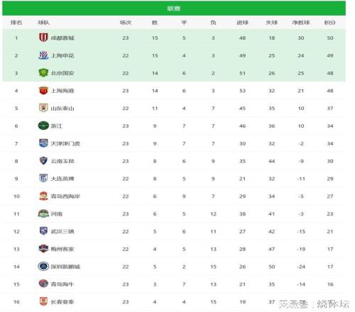 中超积分榜:成都蓉城大胜暂时领跑,云南玉昆绝平亚泰稳住前十