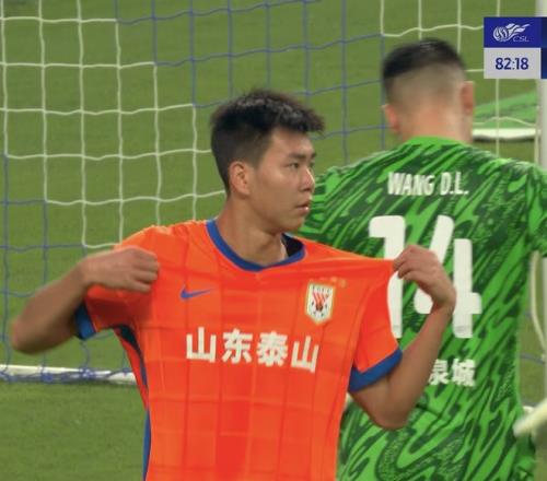 第85分钟,薛庆浩传球给后腰李可,彭逸翔积极铲抢,倒地铲球导致李可丢球,李源一做球给卡扎,后者射门打入本场个人第3球。在泰山队的这粒进球过程中,彭逸翔的大长腿太管用了,他的比赛态度也值得点赞。
