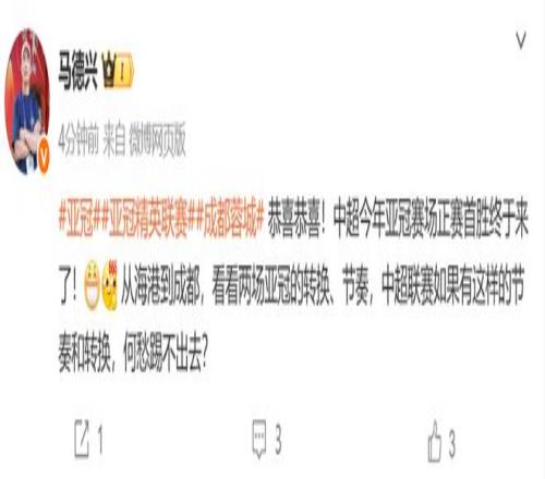 雷速体育9月30日讯 在刚刚结束的一场亚精英赛中,蓉城1-0击败江原FC创造了历史,取得了队史亚冠正赛首个3分。稍早前的另一场比赛中,10人海港1-1战平广岛三箭。 相比于首轮三支球队全败的惨状,本轮截至目前中超球队取得1胜1平保持不败。马德兴在社媒上感慨道:“看看两场亚冠的转换、节奏,中超联赛如果有这样的节奏和转换,何愁踢不出去?” |