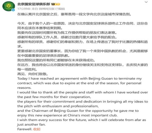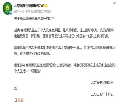 10月5日晚,北京国安官方发布关于主帅基克·塞蒂恩的离任公告。原文如下: 基克·塞蒂恩先生由于个人及家庭原因,经慎重考虑,提出辞职申请。俱乐部董事会接受辞呈,即日起,基克·塞蒂恩先生不再担任北京国安一线队主教练职务。 塞蒂恩先生自2024年12月10日起执教北京国安一线队,共计带队参加32场正式比赛,取得19胜7平6负的战绩。 俱乐部对塞蒂恩先生在此期间的付出表示感谢,并衷心祝愿他在未来的职业生涯与个人生活中一切顺遂! 在确认离开北京国安之后,塞蒂恩用一段文字向北京这座城市深情告别: 今天,由于我个人的一些原因,决定与北京国安足球俱乐部终止工作合同,这份合同本应该在本赛季结束到期。 我要向在这段时间里所有为我工作提供帮助的朋友们表达谢意。 感谢所有的球队工作人员,感谢过往数月里大家给予我的配合。 感谢所有的球员,感谢你们的奉献和努力,在场上传递出了我对于比赛的热情和追求。 更要感谢北京国安的董事长,因为你给了我一个来到中国执教的机会,尤其是能够在中国最重要的足球俱乐部执教。 我也预祝这里的所有同仁都能够在未来获得成功。 在远方,我也将会以北京国安球迷的身份继续关注和支持这支球队,去庆祝大家的每一场胜利。 再见,向你们致敬。 北京电视台国安跟队记者透露了塞蒂恩下课的幕后原因。 该记者表示,对于塞蒂恩,俱乐部管理层其实已经给足了耐心。主场1比3输给申花之后,俱乐部就已经针对暴露出的问题,提出过调整意见。0比6负于泰山之后,从董事长,总经理再到助理教练,都又与塞蒂恩进行了多次沟通,但随之而来的仍是固执和三连败。 导致这次下课的真正导火索,是客战麦克阿瑟的阵容以及场上表现出来的一切。赛前,俱乐部明确向塞蒂恩传达了北京国安有着外战必须全力以赴的传统,在得知首发名单后,俱乐部管理层感到吃惊和愤怒。俱乐部管理层至今为止,都看不到实质性解决问题的举措。 不仅是俱乐部高层,塞蒂恩的助教团队也曾提出了很多意见,但主教练并没有采纳,因此教练团队的失望情绪越来越重。 如果继续让塞蒂恩执教,俱乐部管理层认为球队难以在足协杯决赛前重回正轨,球员也将失去赢得比赛的自信心从而导致更衣室逐渐失控。管理层认为在足协杯决赛之前的联赛+亚冠,每一场都是非常重要的,球队的信心不能失去,因此必须做出调整主教练的决定。 球队目前的首要任务,是重塑信心,重新恢复精神面貌。未来还有四轮联赛,四轮亚冠小组赛,一场足协杯决赛。必须打出水平和精气神,足协杯决赛必须全力争冠。 来源:综合北京国安俱乐部、微博、新华社等 |