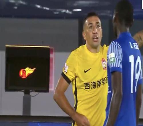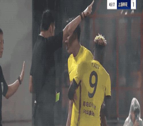 上半场补时阶段,前国脚张呈栋认为边裁应该延迟举旗,因此对边裁喋喋不休,被出示黄牌,队友赶紧上前拦阻。