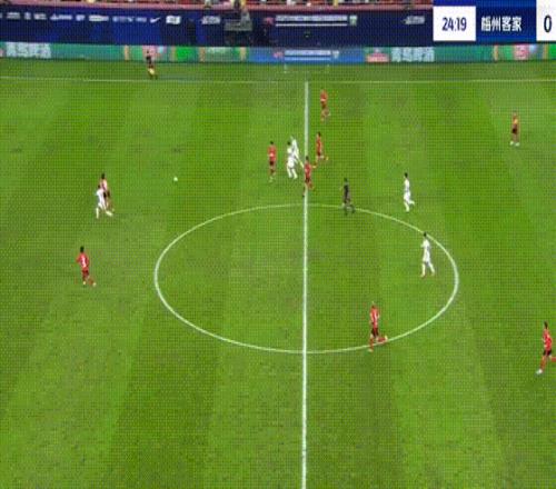 第25分钟,罗德里格带球到禁区摆脱射门,皮球打到胡荷韬变线入网,梅州客家扳平比分。