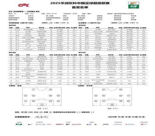 | 北京时间10月18日16:00,中超第27轮继续进行,北京国安作客肇庆新区体育中心体育场挑战深圳新鹏城,本场主裁判为金京元,VAR裁判为张杨帆,赛前双方首发出炉。