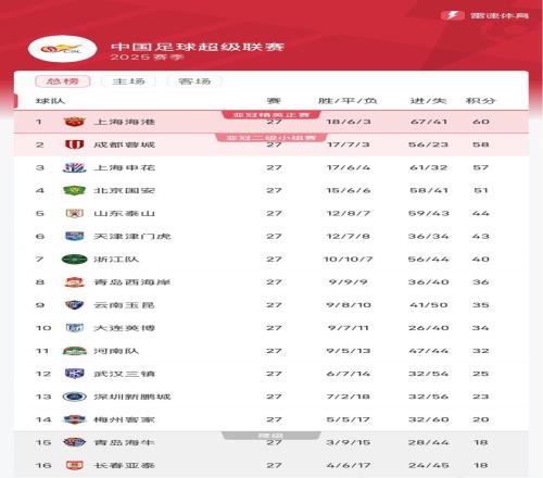 中超联赛最新积分榜:海港2分优势领跑,海牛、亚泰深陷降级区