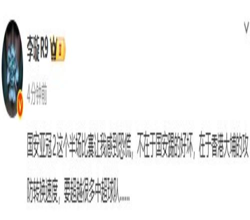 | 雷速体育10月23日讯 亚冠二级联赛第3轮,北京国安对阵香港球队大埔。半场战罢,国安1-2落后。 媒体人社媒发文热议国安1-2落后,李璇写道:“国安亚冠2这个半场比赛让我感到恐慌,不在于国安踢的好坏,在于香港大埔的攻防转换速度,要超越很多中超球队。” |