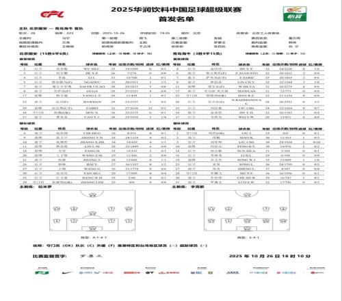 | 北京时间10月26日晚间19:35,中超联赛第28轮,北京国安坐镇主场北京工人体育场,迎战青岛海牛,本场比赛主裁判为马宁,视频助理裁判为万涛,双方首发名单: