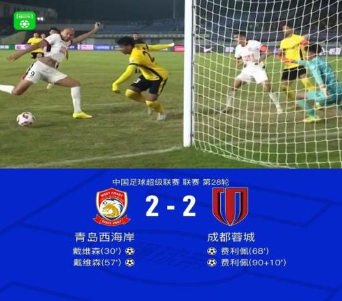 成都蓉城依靠顽强拼劲最后时刻收获绝平。 正确的战术以及运气的眷顾,青岛西海岸队坚决偷鸡踢法,上下半场各一次射正球门就收获进球,射正进球转化率达到惊人的100%。下半场,成都蓉城也积极调整基础阵型,陆续由高中锋费利佩头顶脚踢接连进球,双方最后以2比2平局收场。这场平局,也让成都蓉城错过了反超海港登顶积分榜的大好机会,不过和海港队的积分差距由2分缩小到1分。