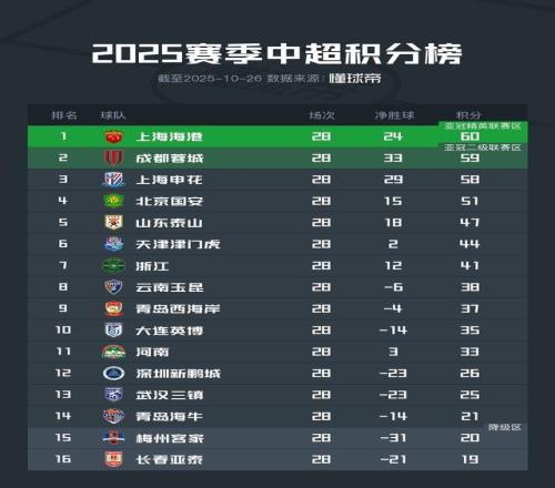 | 北京时间10月26日,中超第28轮比赛全部结束。