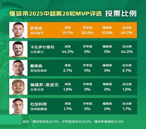 | 大家好,欢迎来到懂球帝2025赛季中超MVP评选现场。中超第28轮MVP得主出炉,青岛海牛队35岁老将、队长萨里奇凭借在工体的3球1助攻,以5.5%的优势反超山东泰山队的前锋卡扎伊什维利,当选本轮中超的MVP。