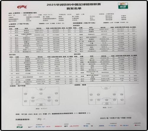 | 北京时间10月31日20:00,中超联赛第29轮继续进行,排名第3的上海申花主场迎战排名12的深圳新鹏城。本场比赛在上海体育场进行,主裁判是麦麦提江。赛前双方首发阵容公布如下: