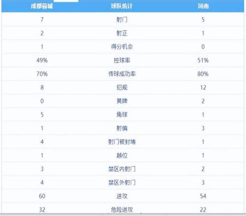 河南首发 二、半场极限承压,河南0-1落后 比赛一开始,意在争冠不掉队的成都蓉城携主场之利对河南阵地发起猛攻,强大的压力使河南队一度阵脚大乱,难以组织成有效的防线。 前10分钟,主队连续获得角球和前场定位球机会,河南队被压迫得头晕目眩几乎难以招架。 第15分钟,主队胡荷韬打进一球,但由于此前主裁判艾堃已经鸣哨吹停比赛,该进球被判无效。这个判罚略有争议,按照进攻有利原则,艾堃本可以略等事态发展再吹停比赛,不过哨声即为判罚,哨声过后再做动作自然无效,此球吹掉也在规则之内。 奈何严鼎皓偏不信邪,利用艾堃改判的前场定位球机会,一脚世界波直挂球门死角,视线被遮挡得王国明只好无奈目送皮球入网。 0-1,河南半场落后。 直到30分钟以后,河南队慢慢找到比赛节奏,稳住军心的同时零星利用纳萨里奥与阿奇姆彭的传切形成一些进攻机会。 但仅此而已,半场河南仅仅在控球率上略略高于主队,但射门数5比7、危险进攻22比32,角球1-5,0-1的比分没有被进一步扩大已经算是侥幸。 拉莫斯中场必须做出应对和调整!