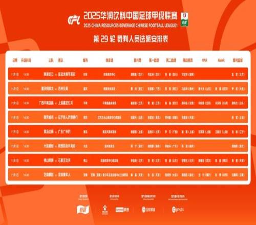 | 11月1日14:30,2025赛季中甲联赛第29轮也就是倒数第2轮8场比赛同时开球。赛前,中国足协发布了本轮裁判人员选派安排。