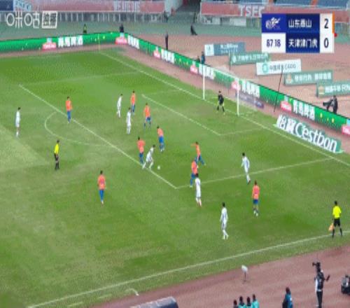 不过,在被罚下一人后,津门虎却马上收获进球。基莱斯在禁区内反复变线后,躲过对手三人包夹,起左脚施射完成破门,将比分改写为1比2。