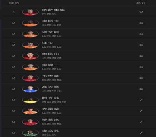 5、助攻王之争 在奥斯卡离开后,中超助攻榜呈现群雄乱战。纳萨里奥9次助攻领跑。身后有7人8次助攻,4人7次助攻,因此末轮比赛谁能获得助攻王殊荣,悬念巨大。 |