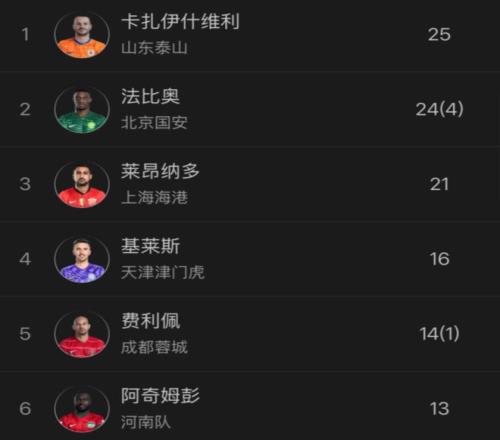 4、金靴之争 将会在3人之间产生,卡扎伊什维利目前打进了25球,法比奥打进了24球,而莱昂纳多打进了21球。泰山末轮面对无欲无求的武汉三镇,目前领跑的他,有望进一步扩大进球数冲击金靴。