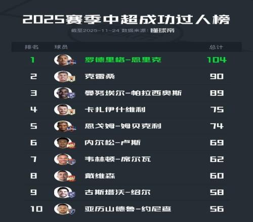 2025中超成功过人榜:罗德里格排第一,已三次成为中超过人王