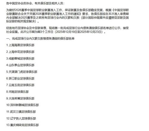 | 中足联公布完成清欠中超名单,不含北京国安,曝海牛工资拖欠半年 文/姜诗华 很多事情,纸是包不住火的。当潮水退去,才知道谁在裸奔?北京时间12月18日晚,中足联公布了首批13家完成清欠的中超球队名单,这其中并不包含北京国安和青岛两支球队,甚至有媒体曝出:海牛队已经拖欠半年工资了。 根据中足联公示的名单,总共有41家俱乐部完成了2025赛季及之前所有足球行业内的欠薪和欠款,其中中超方面有13家俱乐部在列,包括上海海港、上海申花、成都蓉城、山东泰山、天津津门虎,浙江队、云南玉昆、河南队、大连英博、深圳新鹏城、武汉三镇、辽宁铁人以及重庆铜梁龙。缺席的3家俱乐部分别是北京国安、青岛西海岸和青岛海牛。