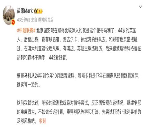 | 此前,有媒体透露一支中超北方俱乐部,与44岁澳超冠军主帅蒙哥马利接触。而北京时间12月19日,知名记者苗原证实,有意蒙哥马利的中超俱乐部正是老牌豪门北京国安。