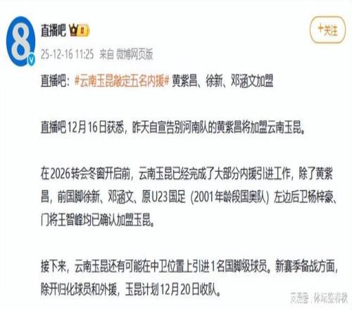 外援引进同样不含糊。巴乙银靴克莱伯到位,引进卡约补强后腰位置,锋线支点和中场硬度一下子上了一个台阶。但如果只靠这些,就想在竞争激烈的中超继续往上爬,显然还不够。于是,本土球员市场成了玉昆接下来真正发力的点。 这段时间,接连有多名球员加盟云南玉昆。徐新、邓涵文、黄紫昌、杨梓豪、王智峰,这些熟悉的名字被串联在一起,拼凑出的,是玉昆俱乐部的野心。
